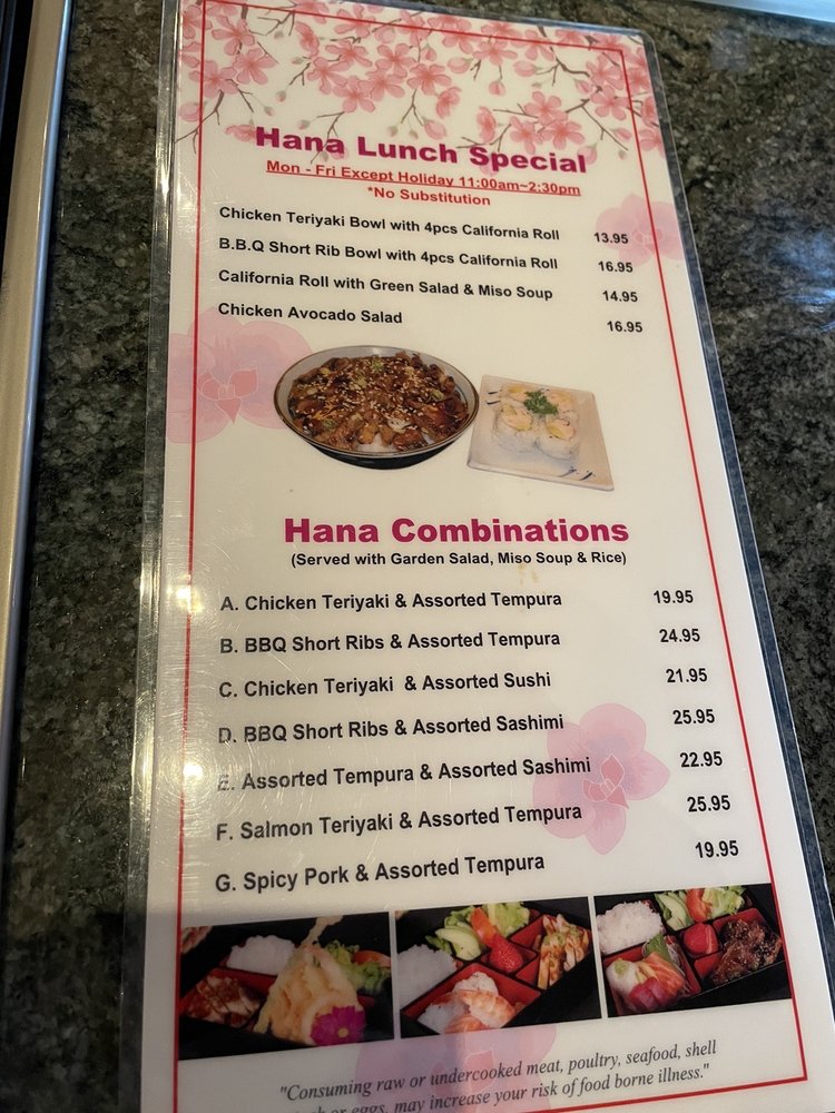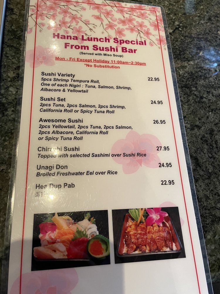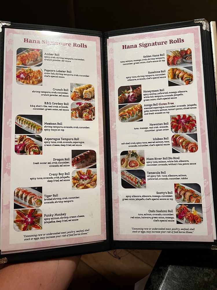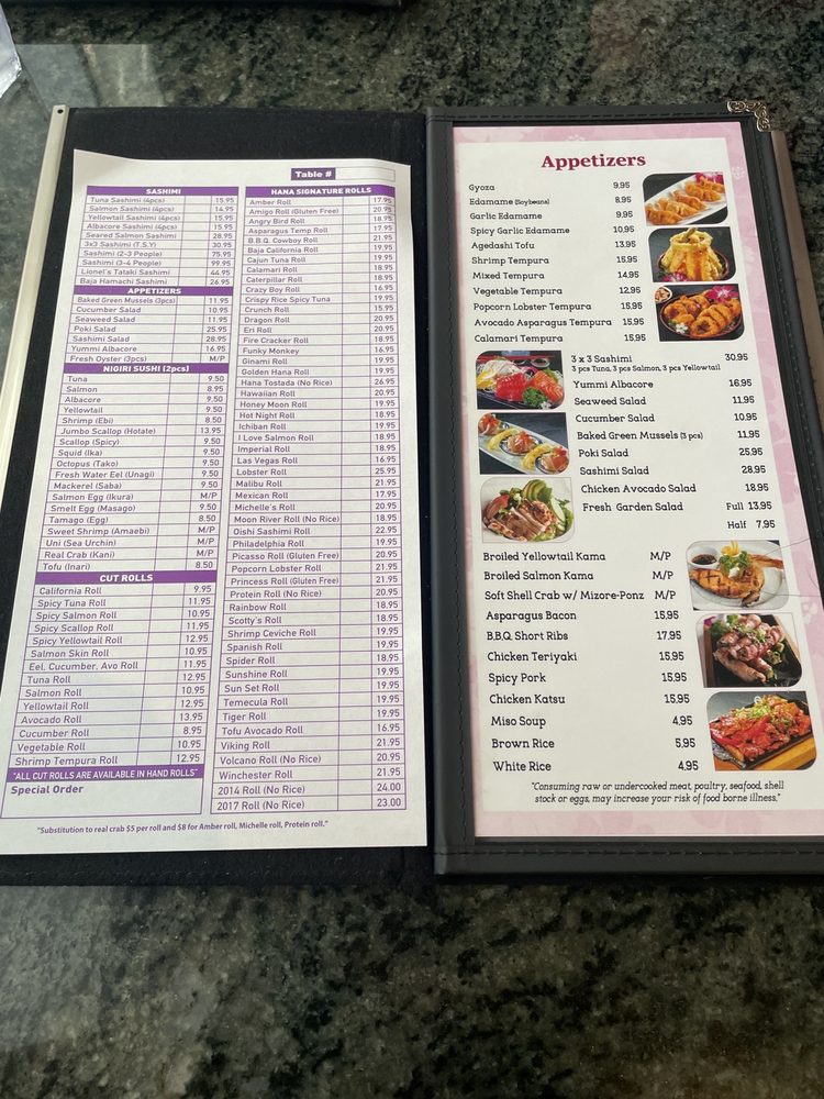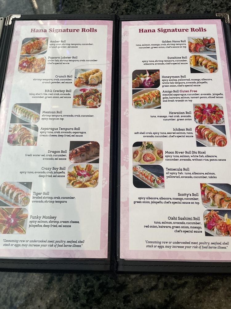 Hana Sushi in Temecula, CA offers a diverse menu with options for everyone. From vegan choices to happy hour specials, they cater to various preferences. Customers rave about the quality of the fish and the creativity of the rolls. The portions are generous, and the fish is fresh. Service is efficient, and the ambiance is comfortable. Prices are reasonable, making it a great option for a casual lunch or dinner. With positive reviews mentioning favorites like the Amber Roll and Imperial Roll, Hana Sushi stands out for its delicious offerings. Whether you're a sushi aficionado or new to the cuisine, Hana Sushi is a must-visit spot.